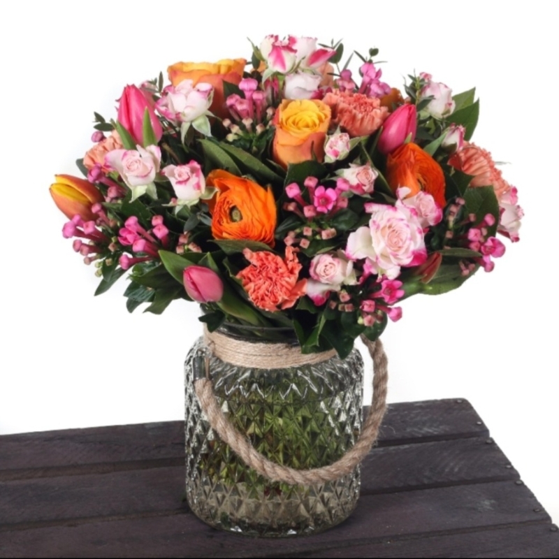 Bursting with citrusy charm, this vase of orange and hot pink blooms sure to brighten up any room. The perfect gift for Mother's Day.