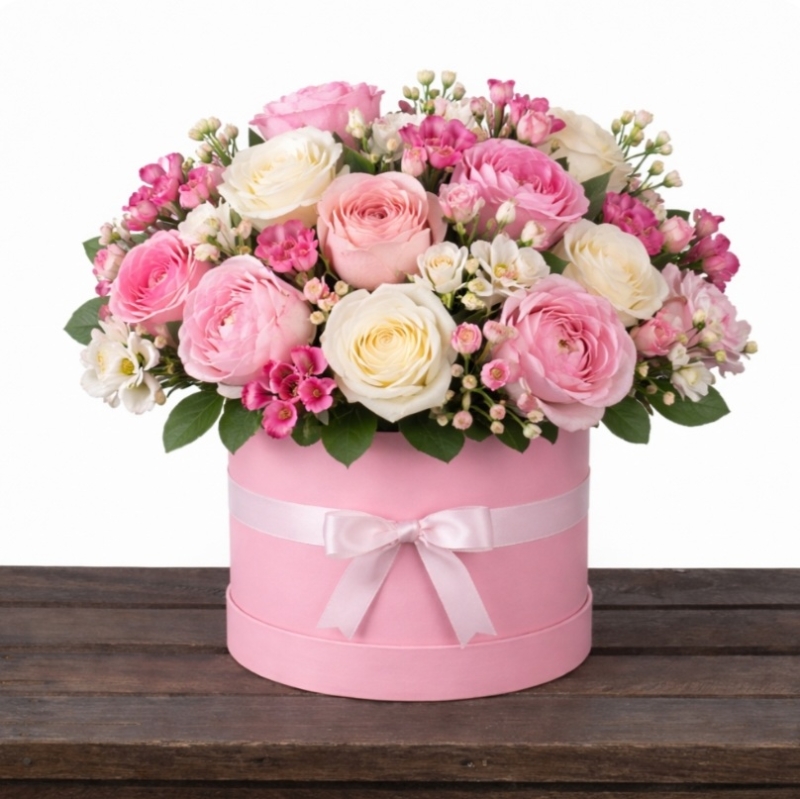 A beautiful hatbox arrangement consisting of pink and white roses complemented with pink bouvardia. Arranged in water ready for an instant display.
